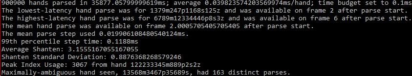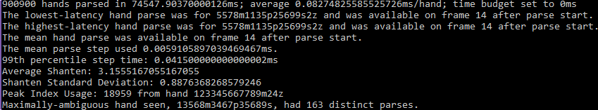 As mentioned, the parser always starts at the root node, even upon resumption. Upon resumption, when it encounters a node marked as completed, it skips over the timeout check and starts recursing into its children. Once it finds a child node that hasn’t yet been completed (that is, a child node that has not yet had its own possible children parsed out of the hand) it starts the parsing process mentioned above, using that child node as the starting point. The timer is not reset, thus including the time needed to find uncompleted nodes in the time budget for that step of the parse. Walking the tree to search for unfinished nodes adds approximately 22% to the total time consumption of a parse 34, but an attempt to make a resumption table to shortcut the walk actually made performance far worse. This could be an area of investigation for future performance improvements, but a more careful design will be needed.