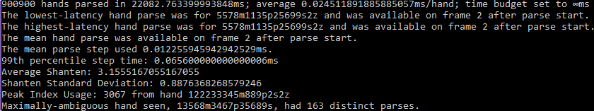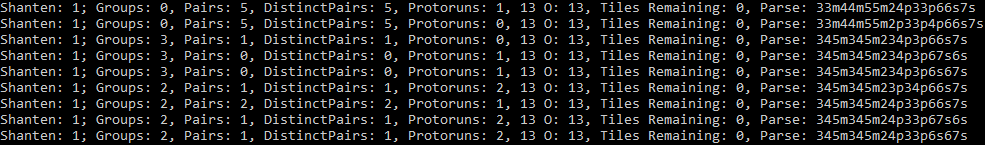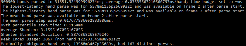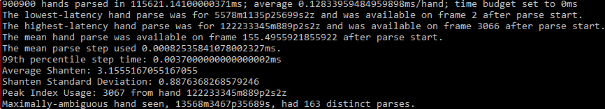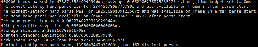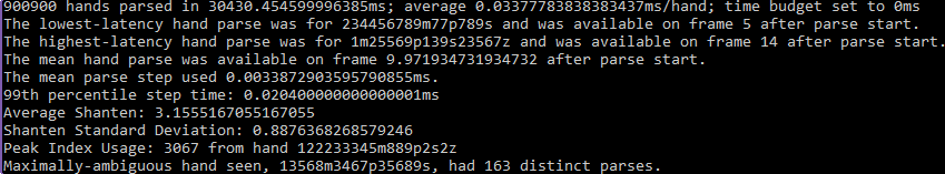 This works due to an element of shanten’s behavior: when you add a tile, shanten can either decrease by one or experience no change; there is a speed cap, as it were, in regards to shanten getting better as you add more tiles. This maximum speed means that it is possible to irrevocably fall behind; that is, we have consumed so many tiles that don’t improve our shanten that we can’t catch up to the best-seen shanten with the tiles remaining, even if those tiles are as good as they can be. So, if the best parse we could possibly make with what we have in progress is worse than the best full parse for this hand yet, it is because we have a suboptimal parse; therefore, we mark this node as failed and try to continue the parse another way, saving us the time of walking down the rest of the hand. The early-out cuts average time usage by ~53% and worst-case space usage by ~84% in the sample data, which is not bad.