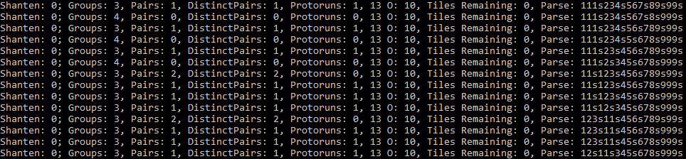 Nine. Nine distinct parses, all yielding the same shanten.11 Thankfully, tile-grouping ambiguity can’t reach across suits (although pairs in one suit influence the value of pairs in another)—but what if you had a hand that was completely made up of one single suit? Say, for instance, you had 1112345678999s?