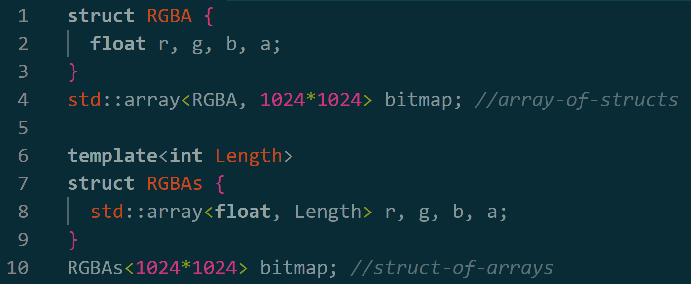 You also don’t have language support when doing struct-of-arrays; you don’t have default initialization, you don’t have nice initializers or support for abbreviated constructor calls, you don’t have any memory management of any sort once you’ve made your arrays. Unless you’re lucky enough to be doing SoA atop autogrowing arrays, you’re also in a rather rarified situation for modern computers with having a limited amount of RAM.41 Those nice squigglies that show up when you forget to initialize something in a constructor? Gone. Default initialization? Gone. All the compiler’s help for managing memory and making sure you’re not forgetting something no longer works. You are on your own when you’re doing struct-of-arrays and you are going to find out why people put the computers on watch for memory-wrangling shenanigans.