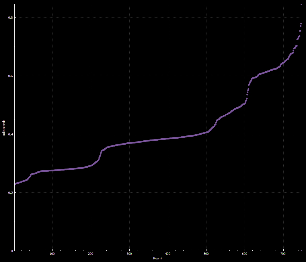 Let’s start with the end result: the amount of frametime each step of the shanten parsing takes out of each frame it’s active. The following chart is from Rehoboam. It shows the amount of CPU frametime devoted to parsing shanten per-frame, sorted from shortest amount of time to longest. In this and the following discussion around numbers and performance, the individual numbers will be color-coded to make clear which machine they came from, using the colors shown in the table above.