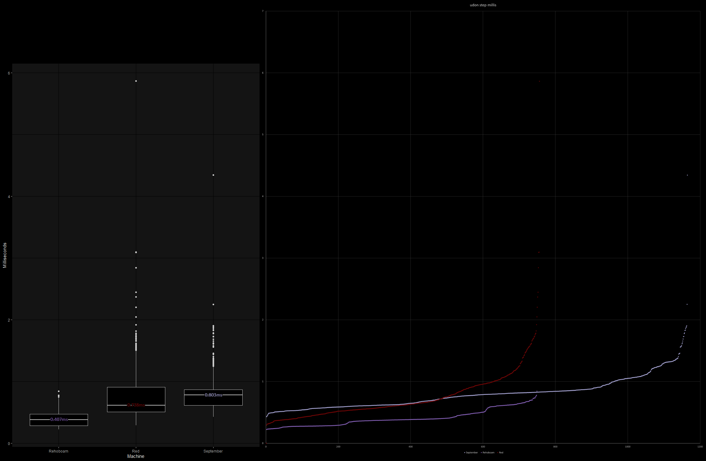 It has also only gotten more effective over time as I have improved performance outside of resumption; the early-out cuts out late steps, and more steps taken means more expensive resumptions; the average latency goes from 10 to 14 without the early-out, a 40% increase, but the total parse time goes up by 145%—those later resumptions are really beating the crap out of the performance—oh, hello O(n²); every step deeper into the parse is more and more state that must be rebuilt. Nasty stuff, that. Still, thanks to there only being 14 tiles, the badness is at least bounded. Unfortunately, for now, it’s staying there; even though performance improvements—some spurred by this writeup itself—have made reentry a larger and larger portion of the total frametime, it seems that Udon hates my guts.53 First, let’s look at just how big the reentry overhead is: